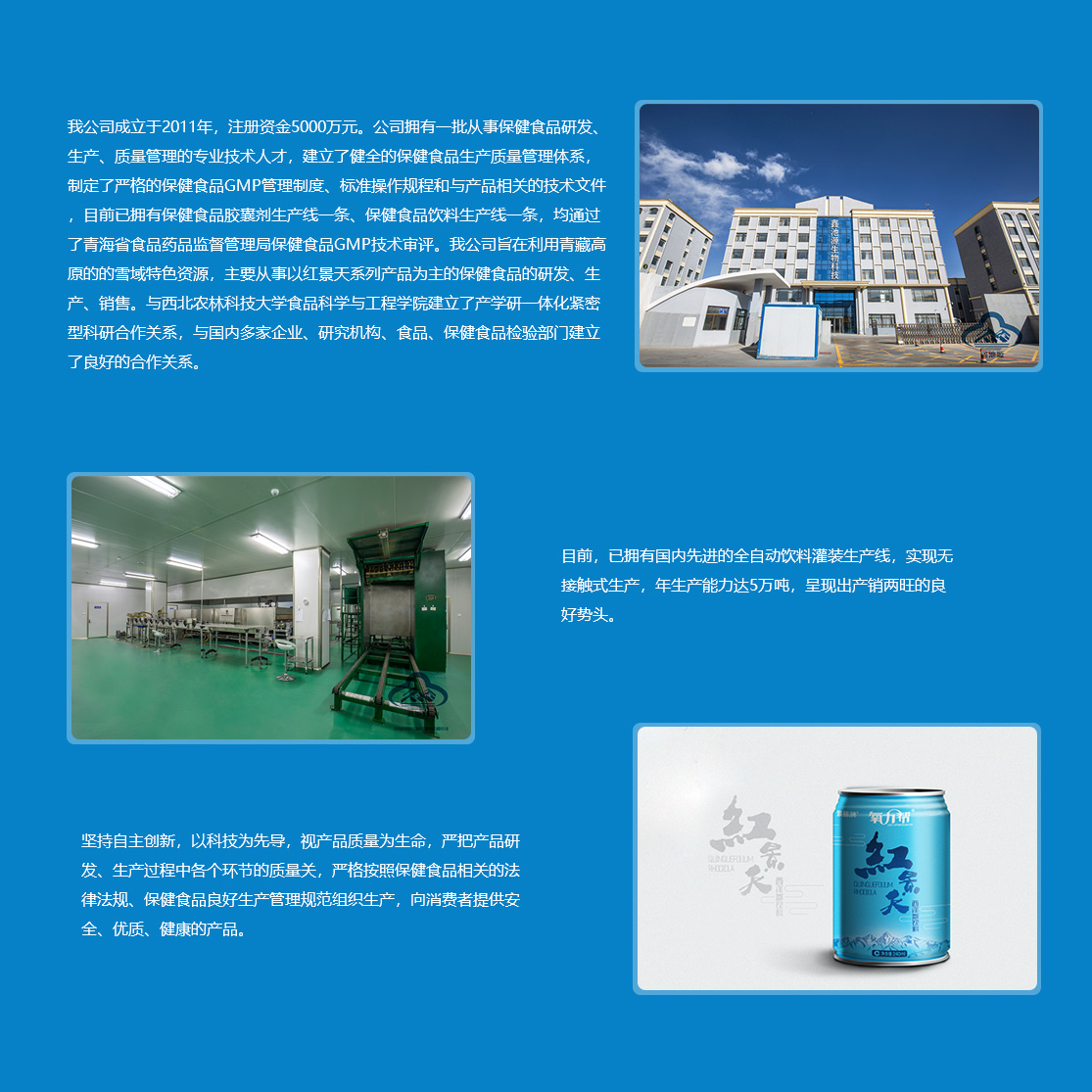 青海鑫池源生物科技開發(fā)有限公司2011年3月29日在青海生物科技產(chǎn)業(yè)園區(qū)工商行政管理分局登記成立,注冊資金5000萬元。         鑫池源公司立足于青海省綠色環(huán)保無污染的高品質(zhì)紅景天資源,以西北農(nóng)林科技大學食品科學與工程學院和青海格拉丹東藥業(yè)有限公司為技術(shù)依托,主要從事紅景天、紅枸杞、黑枸杞等高原生態(tài)植物資源的研究開發(fā)和深加工,產(chǎn)品包括“景胨”牌紅景天西洋參保健飲品、紅景天口服液、紅景天膠囊等系列產(chǎn)品。         公司擁有一批從事保健食品研發(fā)、生產(chǎn)、質(zhì)量管理的專業(yè)技術(shù)人才,建立了健全的保健食品生產(chǎn)質(zhì)量管理體系,制定了嚴格的保健食品GMP管理制度、標準操作規(guī)程和與產(chǎn)品相關(guān)的技術(shù)文件,目前已擁有保健食品膠囊劑生...